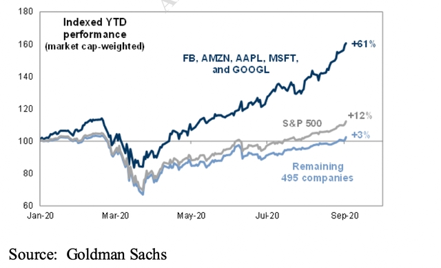 到2020年9月(六个月内),这些股票与3月份的低点相比,几乎翻了一番,较年初上涨了61%。值得一提的是,这五只股票在标普500指数中权重很大,因此它们的表现导致指数整体涨势良好,但这分散了人们对其他495只表现不佳股票的注意力。
