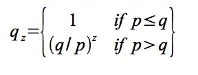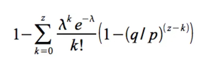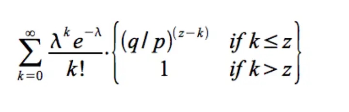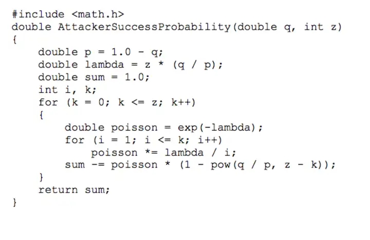 攻击者从一个给定的赤字追上成功的可能性和赌徒破产问题相似。假设一个赌徒从一个赤字开始拥有无限的信用,同时无限尝试的次数去赌以达到盈亏平衡。我们可以计算他达到盈亏平衡的可能性,那也就是一个攻击者追上诚实的链。如下所示。