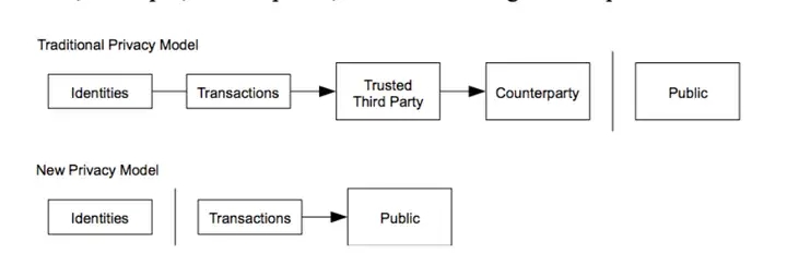 传统银行的模式是给合作伙伴有限的访问权限,同时通过一个被信任的第三方来调用,以来查看一定级别的隐私。除了这个方法,维护隐私还需要通过打断信息流的一些地方,通过匿名的公共密钥,以公开需要的所有的交易。公众可以看到某人发送给其他人的数字,但是没有交易人的信息,这个很像股票交易所的信息发布级别,公众记录了单比的交易的时间和规模,但是不知道谁交易的。