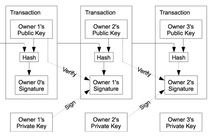 我们首先定义一个电子货币就是一个包含了一串数字签名的链。每一个币交易者通过用哈希技术对上一个交易信息和下一个拥有者的公共密钥两者进行加密,然后进行数字签名,最后将这些信息添加到这枚电子货币的末尾。下一个收款人通过私有密钥与链里的公有密钥进行签名验证,以确认自己是链也就是这枚电子货币的拥有者。