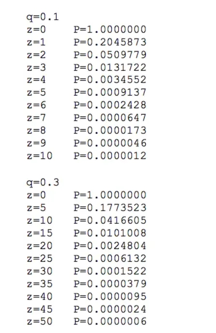 我们假设p>q,可能性随着攻击者追上数据块的增加呈指数下降,随着概率和他做对,如果他不能在早期幸运的赶上,越往后,他的机会会变的很渺茫。
