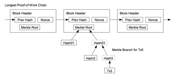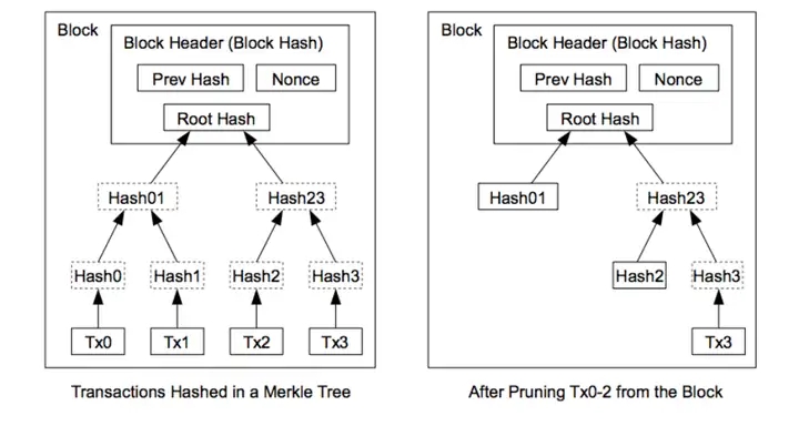 一个货币里最后的交易已经被足够多的数据块覆盖,那么这个支付交易之前的数据可以不再被使用以节省磁盘空间。为了在不打断数据块的哈希前提下促进它。交易被哈希进默克尔树(Merkle Tree),这样只这个数据块哈希的根需要被包含进来,老的数据块可以被压缩进树的接下的分支而拔除。内部的哈希不需要被存储。