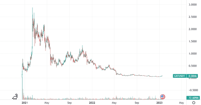 GRT 是有史以来最好的 AI 代币。超低盘也进入了山寨币的名单。历史最高价约为 2.6 美元,今天已达到 0.0827 美元。如果再次触及历史高点,那么4000%的回报率很容易实现。千万不要错过这枚硬币。